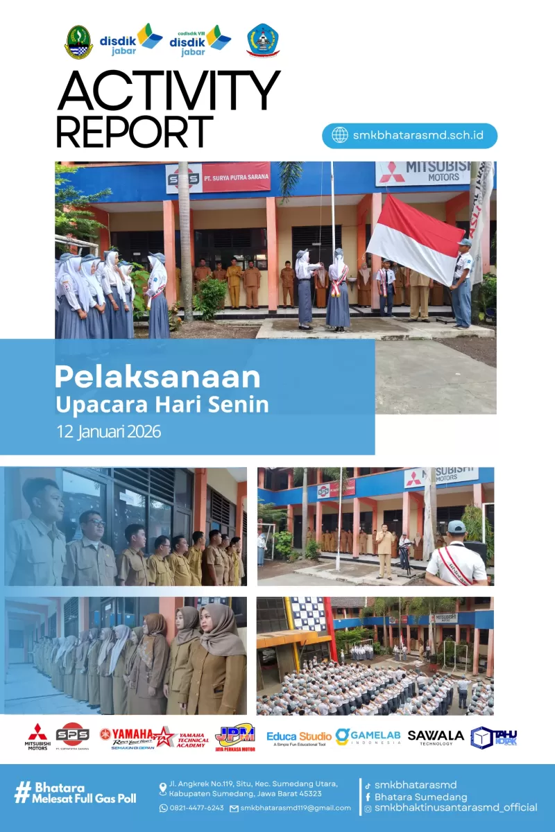 SMK Bhakti Nusantara Sumedang melaksanakan kegiatan upacara bendera pada Senin pagi sebagai upacara perdana di awal pembelajaran semester genap Tahun Ajaran 2025/2026. Upacara ini diikuti oleh seluruh dewan guru serta peserta didik dan berlangsung dengan tertib, khidmat, serta penuh semangat.